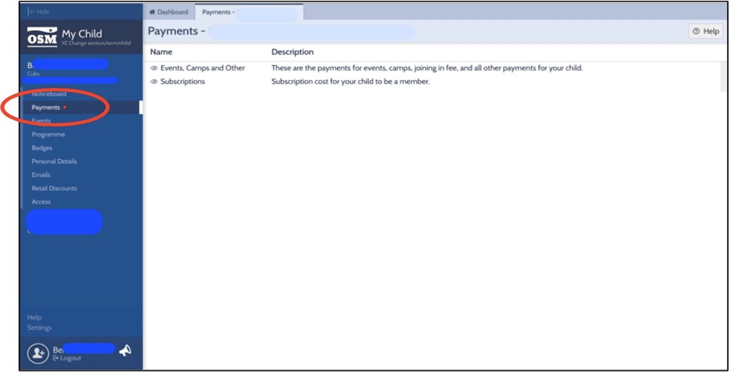 • Once on OSM, select your child’s name from the left-hand side andthen the ‘payments’ tab as below.
