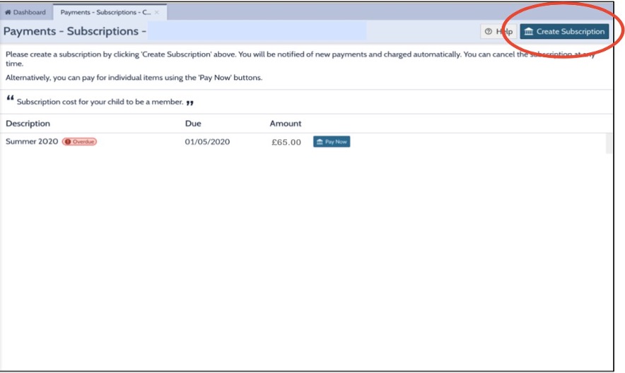 • Select ‘Create Subscription’, as circled above, to set up the direct debit.you will need to set up a direct debit for both Subscriptions and Events.