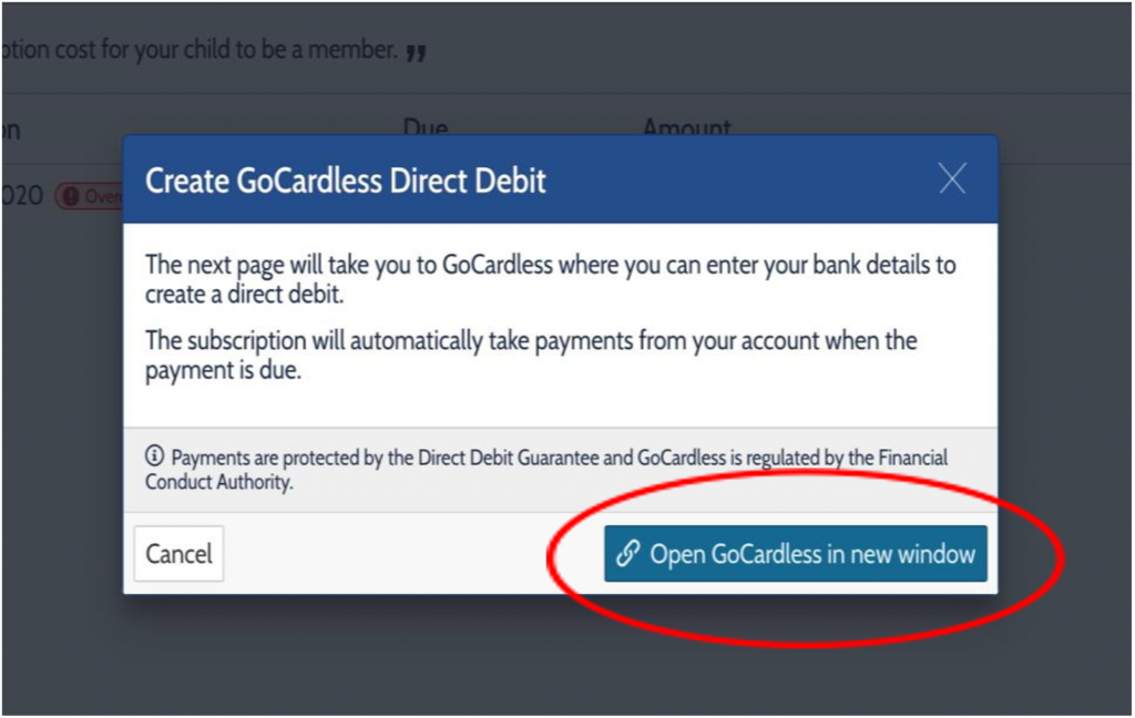 In this guide, I will show you how to set up a direct debit for the subscription fee, however you will also need to do the same for the ‘Events and  Camps’ sections, following the exact same instructions as below.